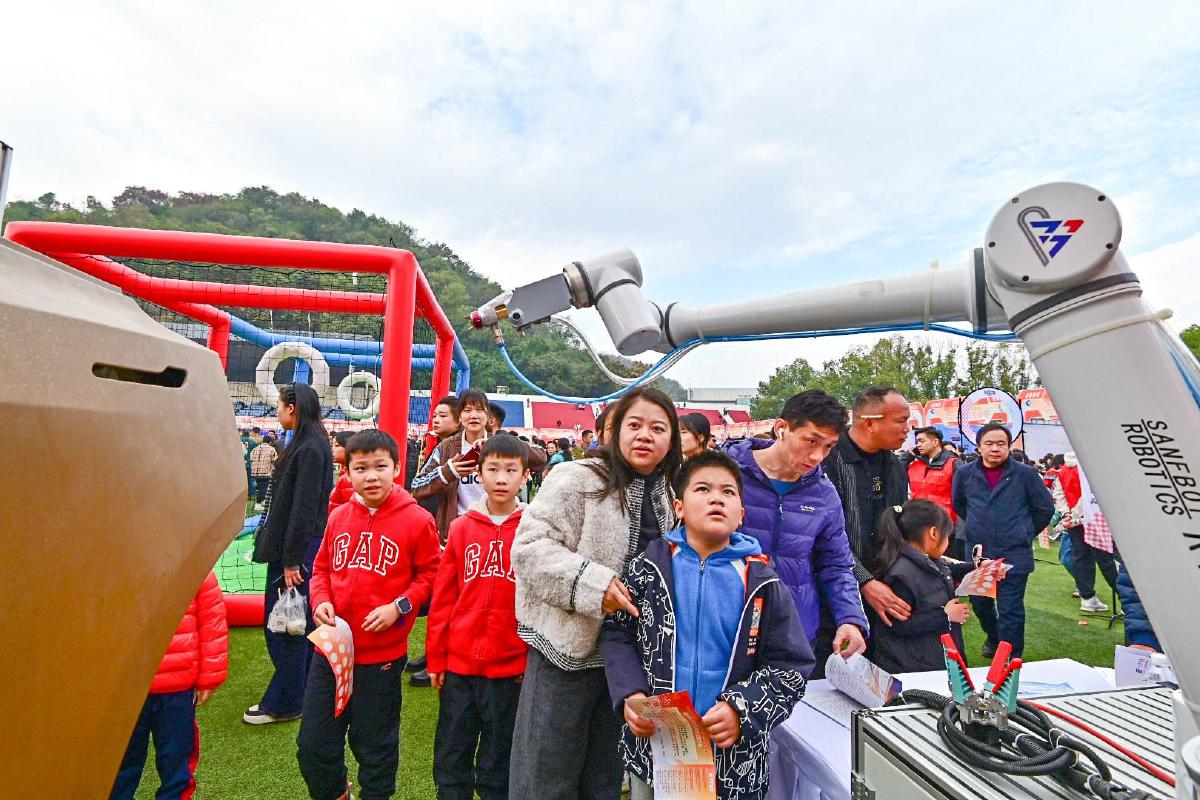 企业展区各具特色,参展的6家企业拿出看家本领,将前沿科技从实验室和生产一线直接“搬”到孩子们面前。大疆全系列无人机、三丰智能基于3D视觉的快速建模喷涂机器人,让同学们大开眼界。天穹智航青少年无人机俱乐部设立的“无人机足球”对抗赛,更是吸引了众多孩子参与。东贝压缩机打造的“清凉科技”展区充满生活气息,让参观者直观感受到工业科技如何服务日常生活。