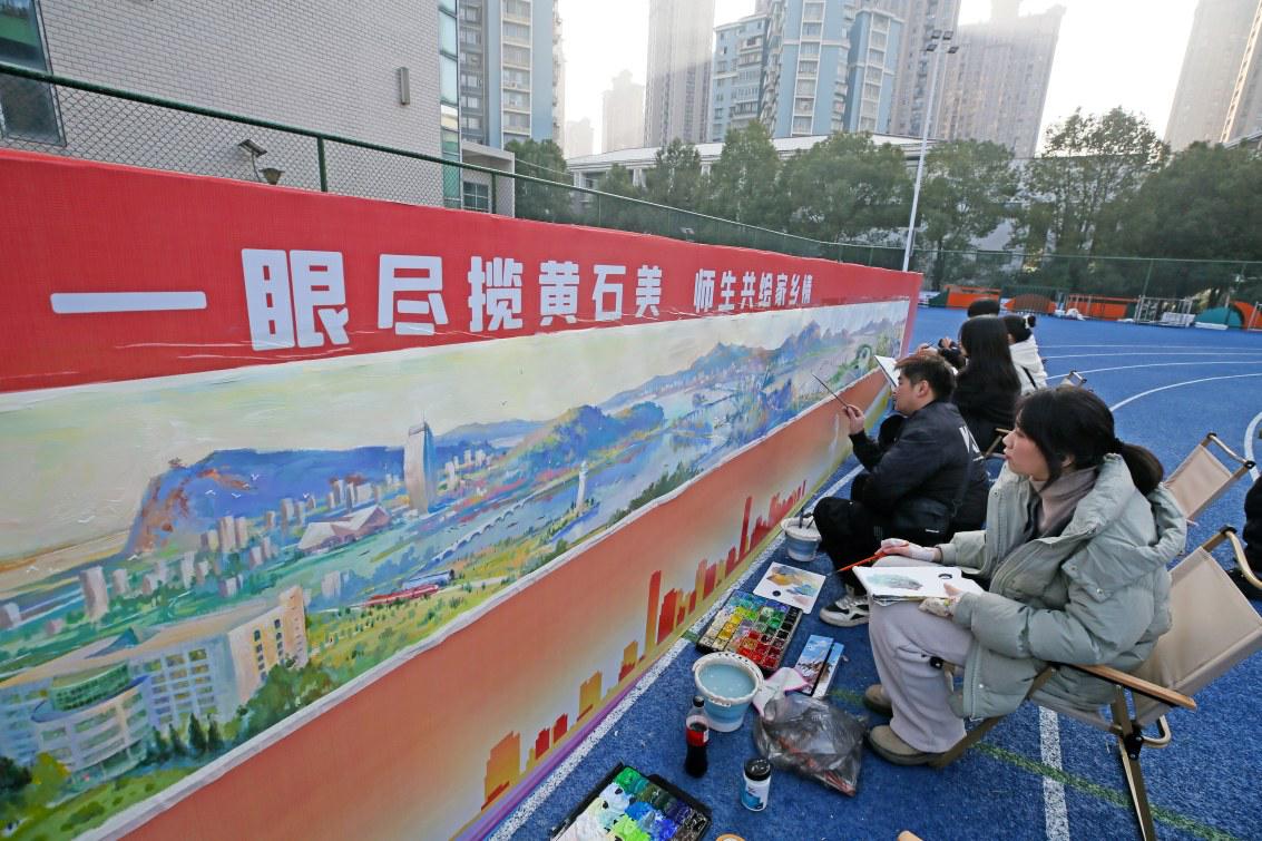 作品主创、黄石艺术学校(艺术高中)美术教师张勇介绍,从初稿到定稿,前后经过了1个多月的时间构思、修改。“半城山水半城湖,黄石是一个美丽的城市。”张勇说,带领同学们一起来创作,一方面是在专业上对同学们进行培养,另一方面也是为了培养他们爱国、爱家乡、爱学校的情怀。