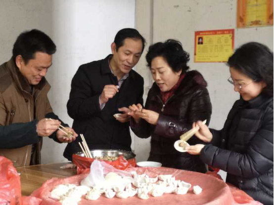 市教育局党组书记、局长,市民办教育行业党委书记张足意来到“亲戚”柯桃子家,还来不及放下礼品,就握住老人的手,连声祝福她新年快乐、健康长寿。在柯桃子家,张足意脱下棉袄,挽起袖子,包饺子、煮饺子,烧柴灶、炒大菜,风风火火,很短时间内就做好一桌好菜。市民办教育行业党委副书记、市民办教育协会会长何学雄连忙招呼大家一起端菜上桌,热热闹闹地吃起了团年饭。