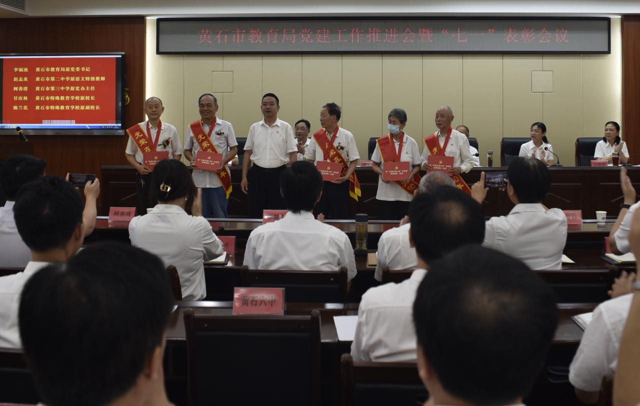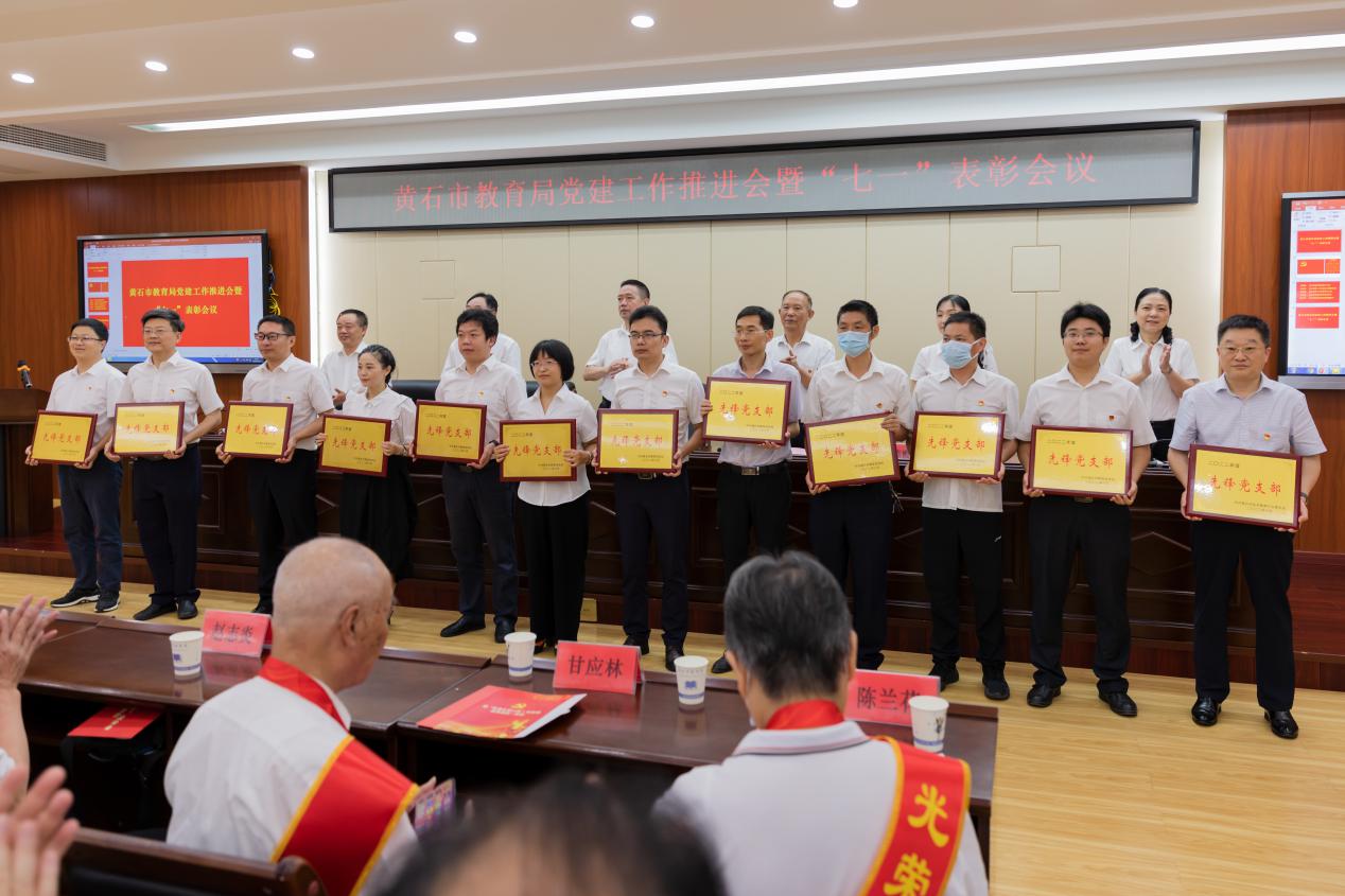 会上,举行新党员入党宣誓仪式,老党员重温入党誓词。市教育局党组书记、局长张恩强同志为李福迪等五位“光荣在党50年”纪念章获得者颁发纪念章和慰问信。市教育局党组成员、副局长肖惠东宣读表扬通报,湖师大附中(黄石一中)第一党支部等12个支部被评为“先锋党支部”,高秀英等67名同志被评为“党员先锋岗”称号。市教育局领导班子成员分别为党员先锋岗代表和先锋党支部书记颁奖,获奖代表围绕下基层察民情解民忧暖民心实践活动开展情况作交流发言。